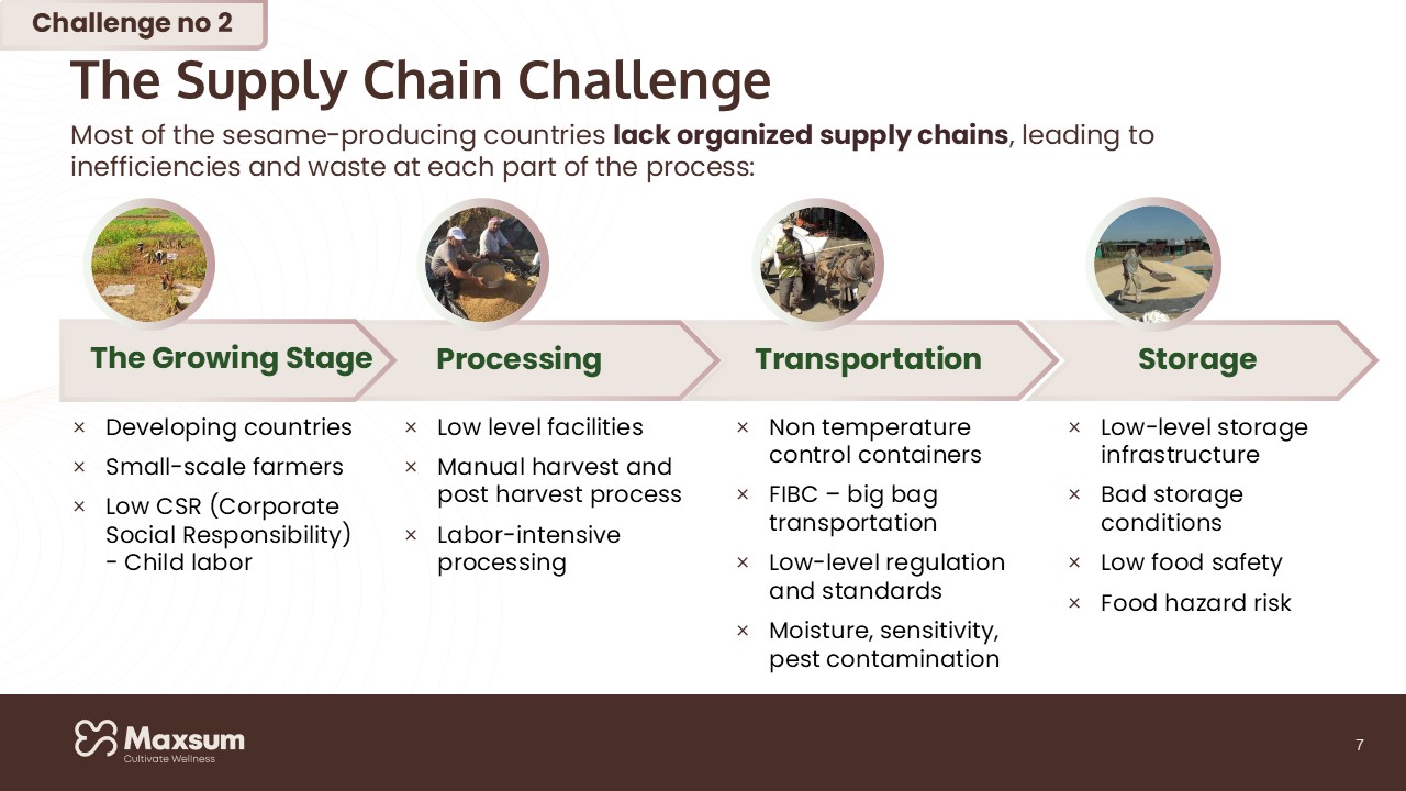 עיצוב מצגת זה מציג את מקסום, מובילה בחדשנות חקלאית בתחום השומשום, דרך שפה ויזואלית נקייה ומקצועית. הוא מדגיש את גישתה המתקדמת בטיפוח זנים, מומחיות צוותה, בניית שרשרת אספקה בת קיימא ומלאה ביכולת מעקב ("מהזרע לשוק"), ואת שותפויותיה האסטרטגיות הגלובליות.